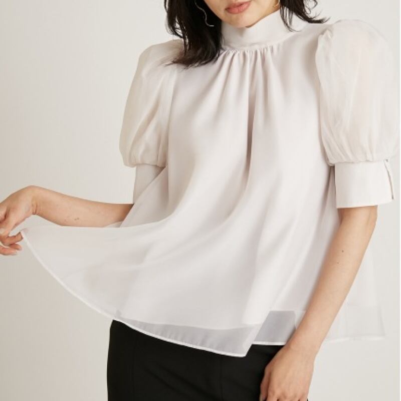 甘い弓レースアップスタンドカラーブラウス女性の夏のルーズプリント Bluas パフ半袖オーガンザシャツトップス ショート リボン ハーフスリーブ 大人ガーリー スウィート キュート カジュアル サマー 夏物 | eight