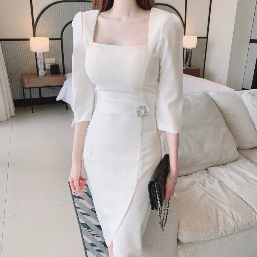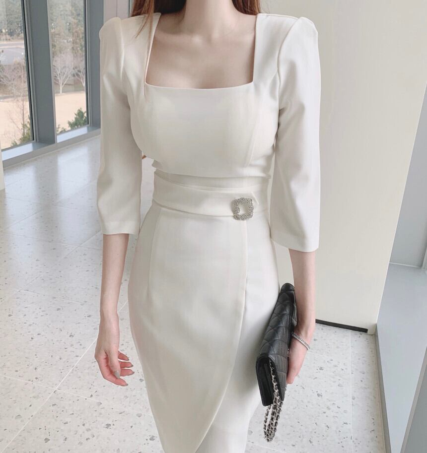 Komiyama Feminino ウエストボディコンドレスソリッドスクエアカラー Vestidos 春ドレス女性ダイヤモンドベルトローブ スプリング 春物 ハーネス ソリッドカラー スクウェア | eight