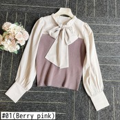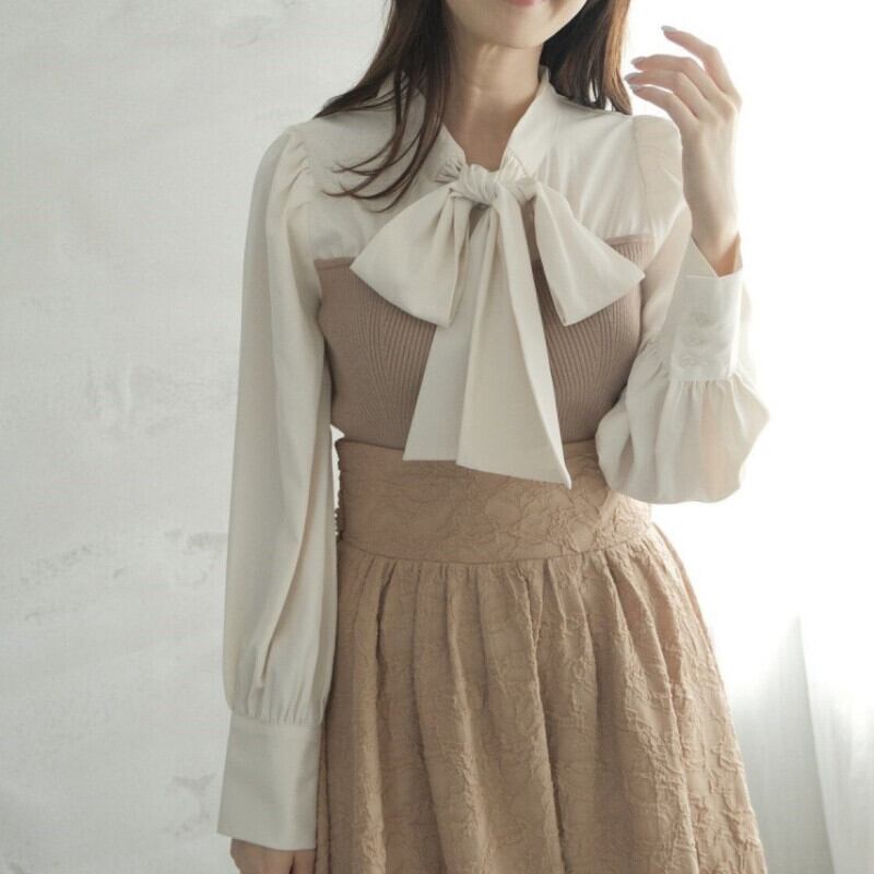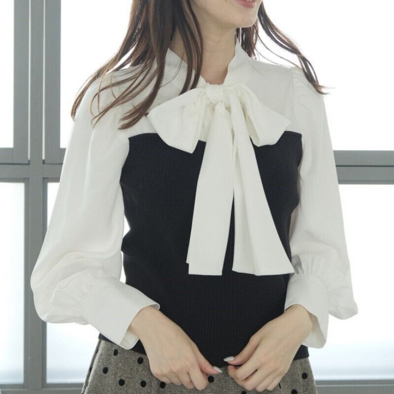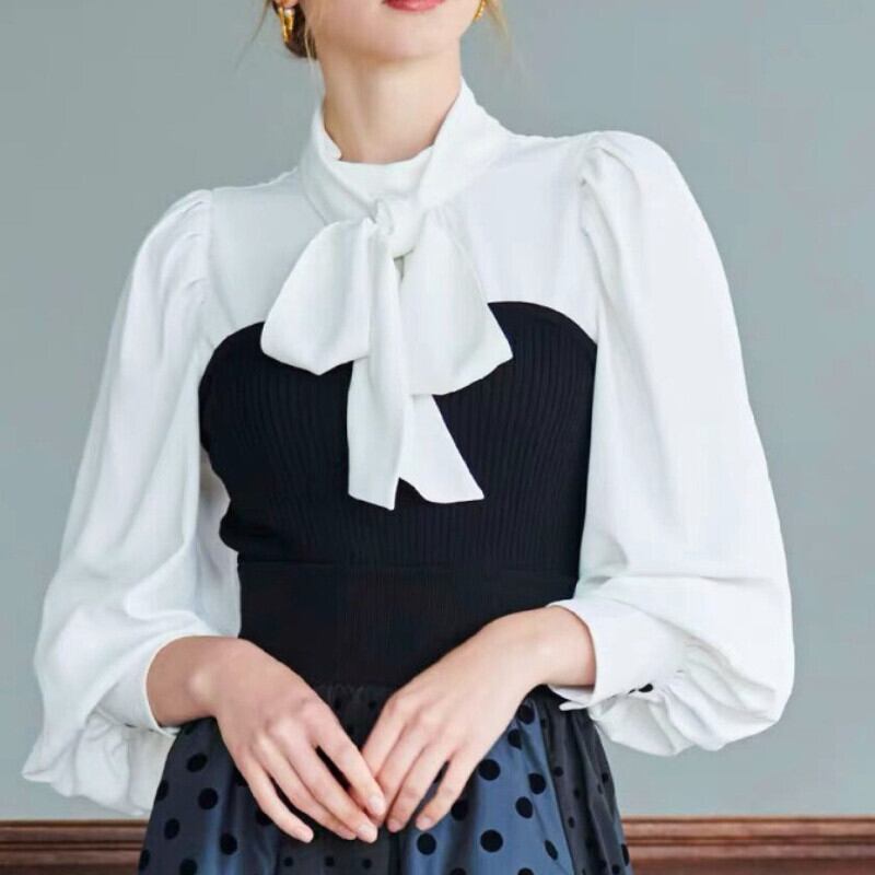 甘い弓レースアップ Knitwears ヒットカラーフェイクツーピースセーター女性春秋 Y2k 服プルオーバートップス リボン 大人ガーリー スウィート キュート カジュアル スプリング 春物 オータム 秋物 | eight