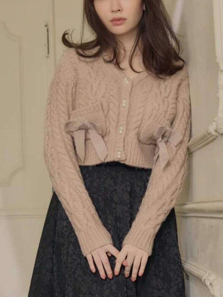Vネックパールボタン付きセーター甘いちょう結びポケットツイストニットカーディガン秋冬服美的コート リボン 大人ガーリー スウィート キュート カジュアル オータム 秋物 ウィンター 冬物 真珠 | eight