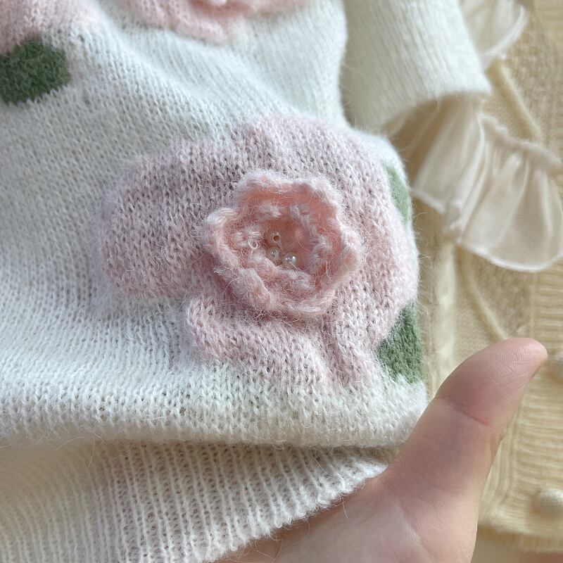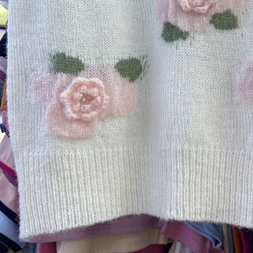 Komiyama シックな 3d 花セーターの女性の夏の甘い Y2k 服 O ネック半袖 Knitwears ビーズプルオーバートップス ショート ハーフスリーブ 大人ガーリー スウィート キュート カジュアル サマー 夏物 花柄 Oネック | eight
