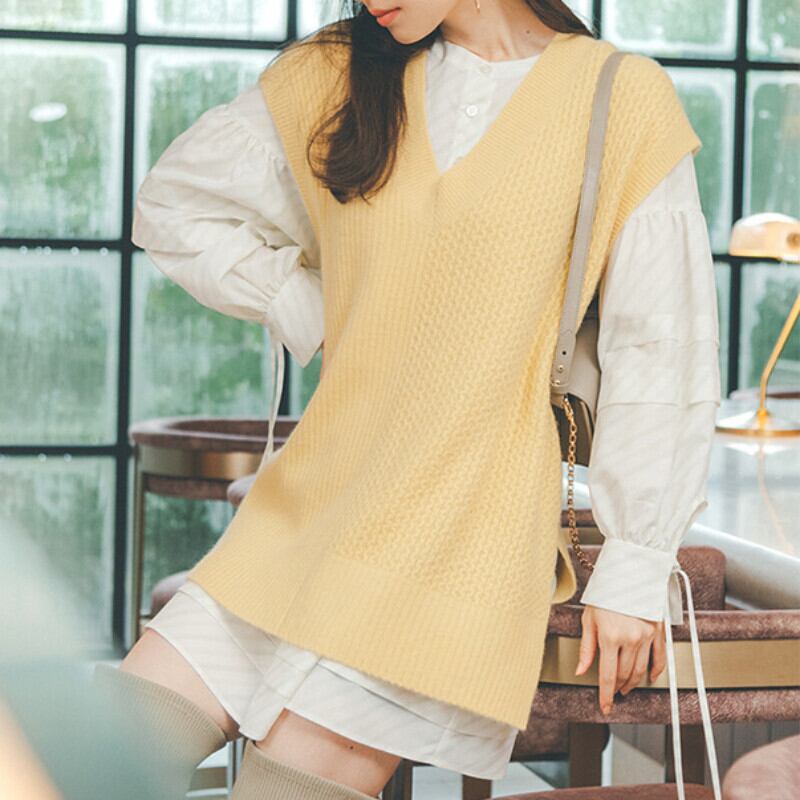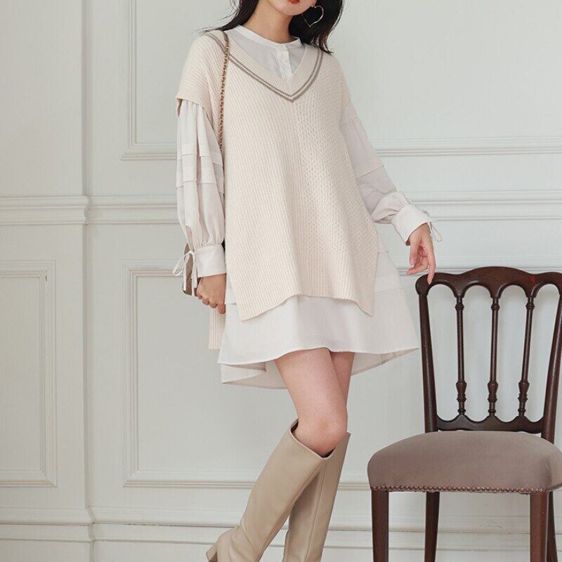 秋 2 peice セットレディース V ネック Sleeveles ニットセーターベスト + 白ミニシャツ Vestidos 優しい妖精ドレススーツ ホワイト オータム 秋物 Vネック | eight