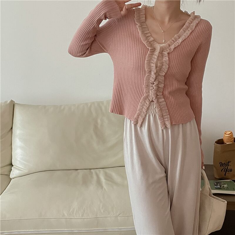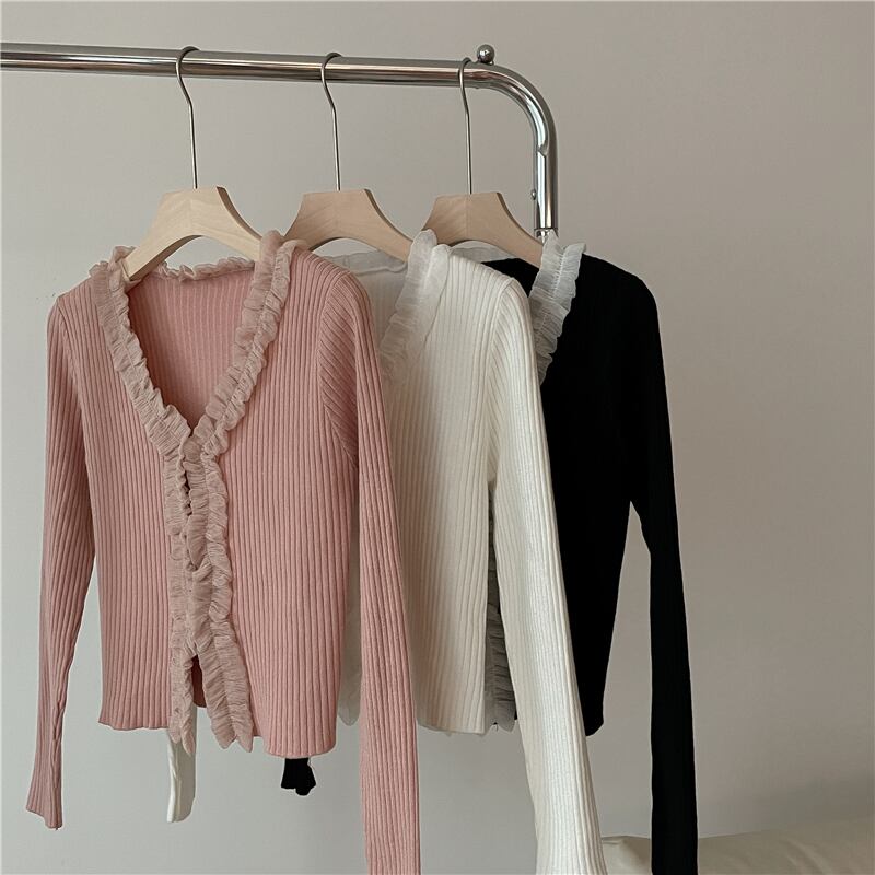 Komiyam V ネックフリル Y2k 服長袖セーター女性秋冬美的カーディガン甘いシックなニット ロング ラッフル 大人ガーリー スウィート キュート カジュアル オータム 秋物 ウィンター 冬物 Vネック | eight