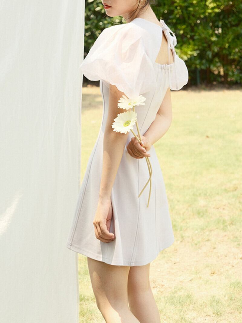 Feminino セクシーな背中の開いた巾着ローブ甘いラウンドネックパフスリーブ A ラインドレス女性美的ミニドレス 大人ガーリー スウィート キュート カジュアル Oネック Aライン | eight