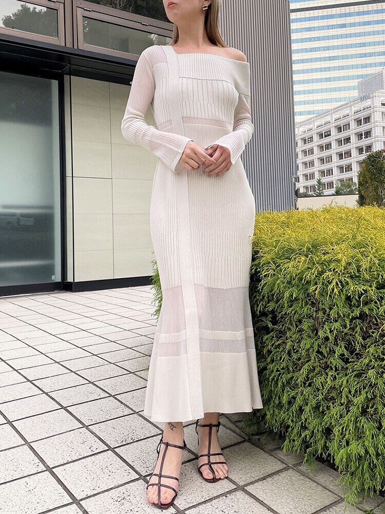Komiyama 美的オフショルダー長袖 Vestidos 非対称ボディコンドレス春ニットドレス女性甘いローブ ロング 大人ガーリー スウィート キュート カジュアル スプリング 春物 | eight