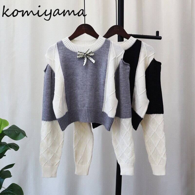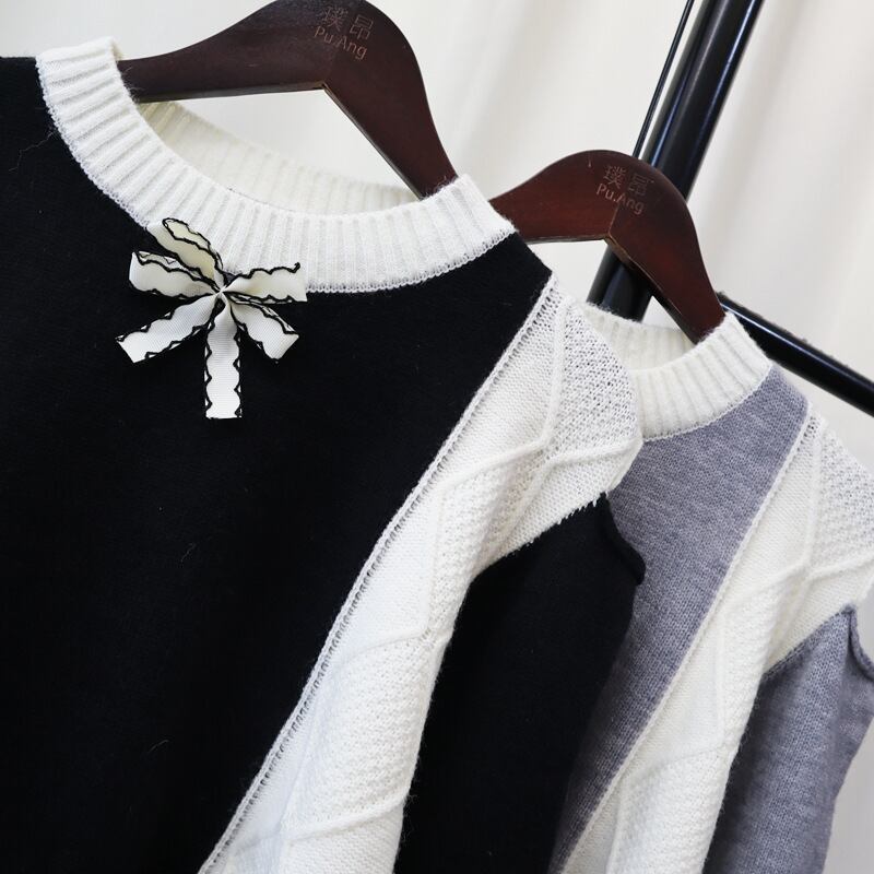 小宮山甘いシックなヒットカラーニットプルオーバートップスオフショルダー長袖セーター秋ラウンドネックボウセーター女性 ロング リボン 大人ガーリー スウィート キュート カジュアル オータム 秋物 Oネック | eight