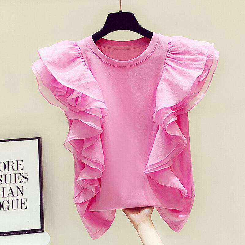 夏イン O ネック Y2k 服シックなガーゼパッチワークフライングスリーブトップス女性固体甘いフリル Tシャツ ラッフル 大人ガーリー スウィート キュート カジュアル サマー 夏物 Oネック ソリッドカラー | eight