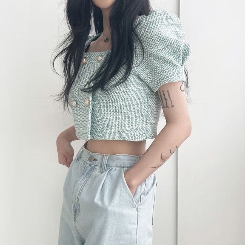 Komiyama スクエアカラーダブルブレストジャケット春夏服女性パフ半袖コートパールボタン Outwears ショート ハーフスリーブ スプリング 春物 サマー 夏物 真珠 スクウェア | eight