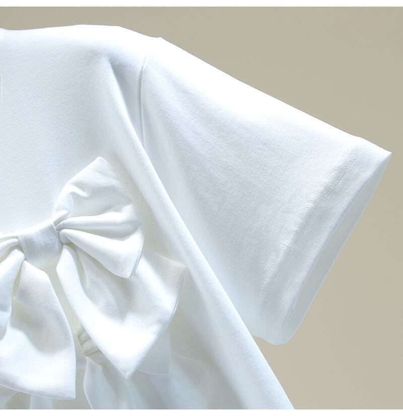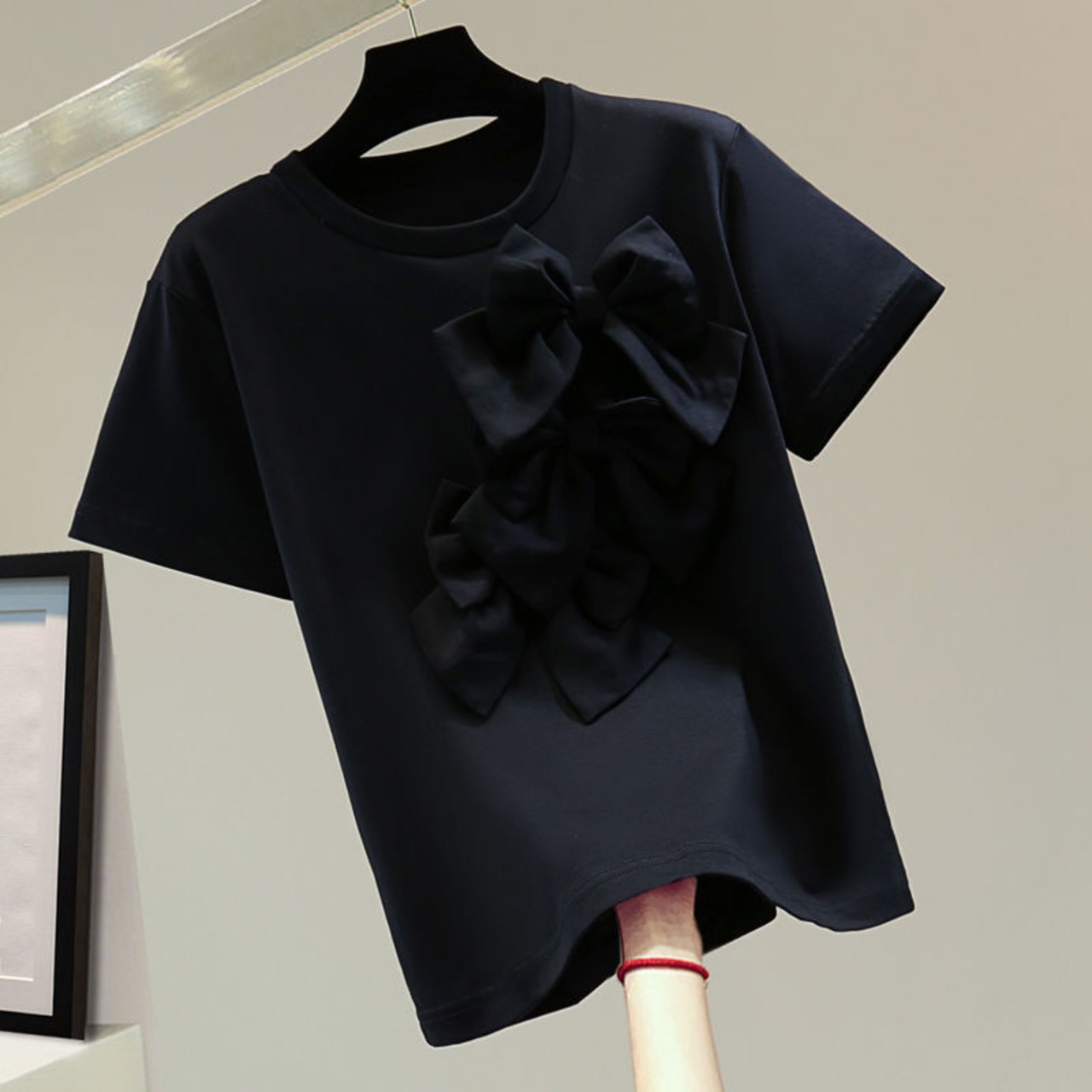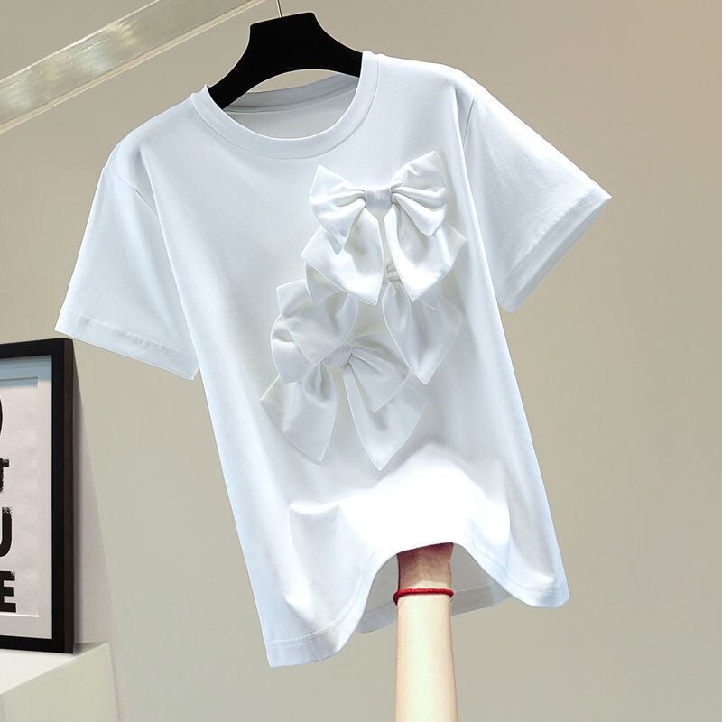 甘いシックな 3d 弓パッチワークトップス夏 O ネック半袖 Y2k 服ルースすべて一致 Tシャツ女性 ショート リボン ハーフスリーブ 大人ガーリー スウィート キュート カジュアル サマー 夏物 Oネック | eight