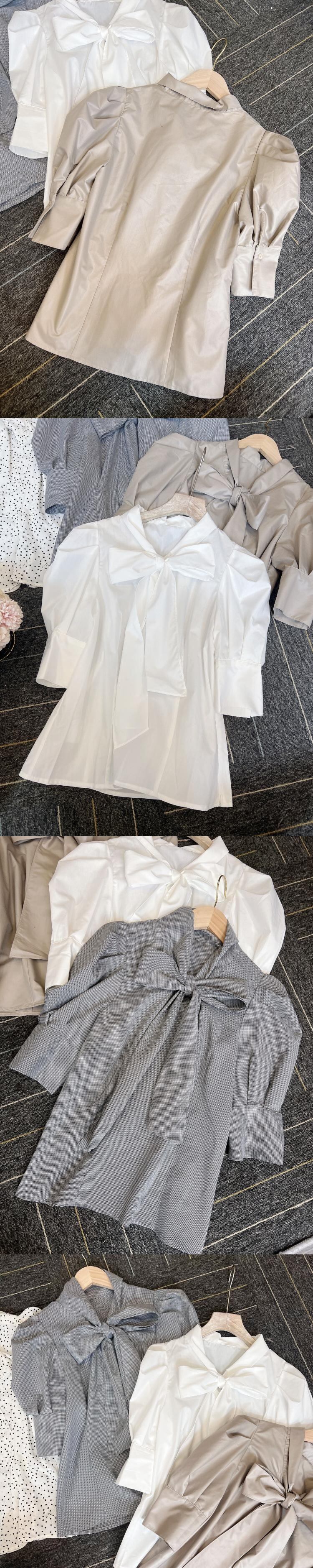 小宮山スタイルシックな蝶ネクタイシャツトップス夏秋スウィートパフスリーブブラウス女性レトロソリッド リボン 大人ガーリー キュート カジュアル サマー 夏物 オータム 秋物 ソリッドカラー | eight
