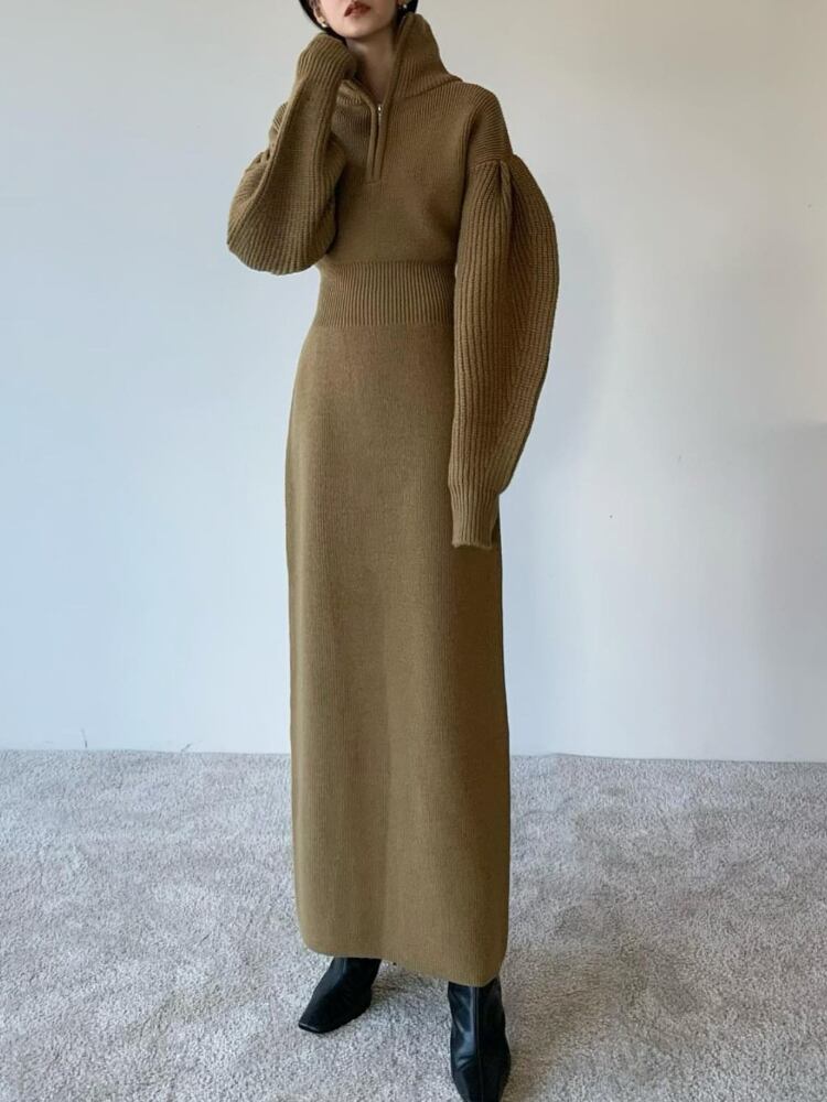 ハーフジッパータートルネックセータードレス長袖ニットローブ秋冬ミディ Vestidos ロング オータム 秋物 ウィンター 冬物