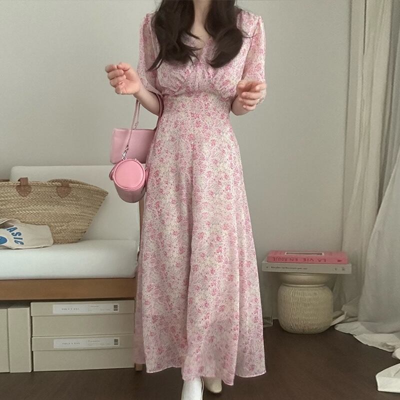 Komiyama V ネックブロークンフラワードレスパフ半袖 Vestidos サマードレスシックレースアップチュニックローブ ショート ハーフスリーブ 夏物 Vネック フラワーデザイン | eight