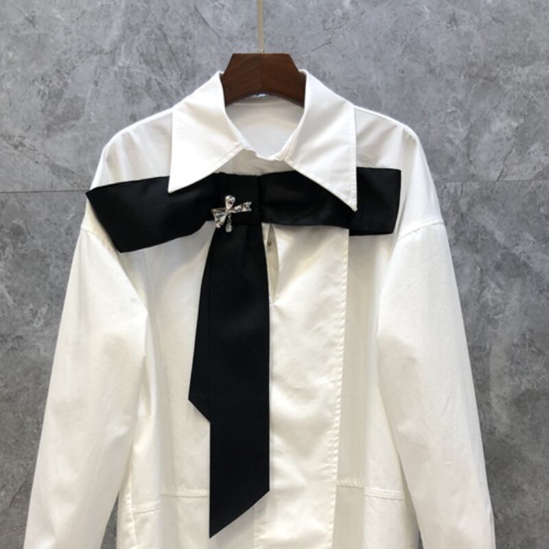 Komiyama 甘いレースアップ黒弓シャツ春長袖白ルーズオールマッチシャツブラウス ロング ホワイト ブラック リボン 大人ガーリー スウィート キュート カジュアル スプリング 春物 | eight