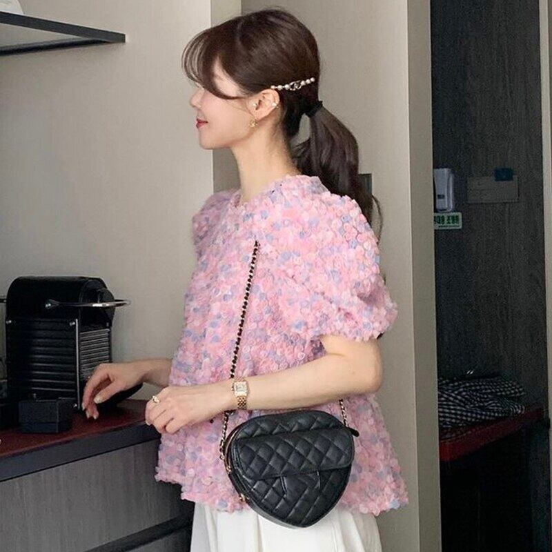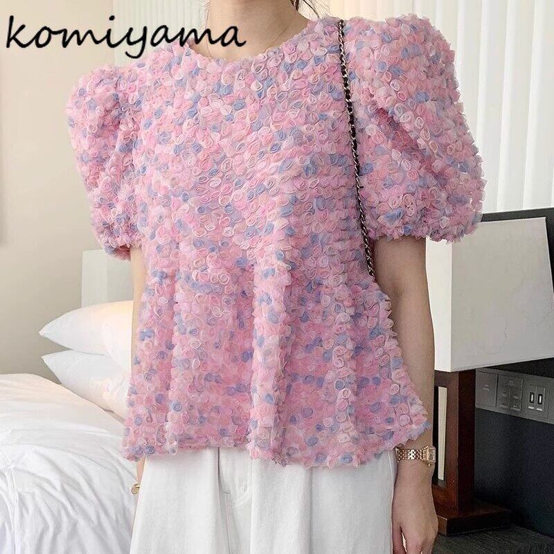 Komiyama Sweet Heavy 3d Rose 服 夏 Oネック シャツ トップス シック ルーズ パフスリーブ 大人ガーリー スウィート キュート カジュアル サマー 夏物 | eight