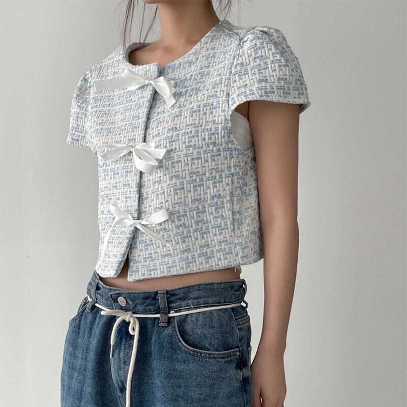 Komiyama スウィートレースアップボウジャケット夏 O ネックツイードコートシッククロップトップ半袖 Veste ショート リボン ハーフスリーブ 大人ガーリー キュート カジュアル サマー 夏物 Oネック | eight