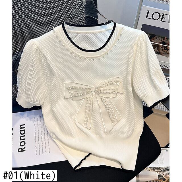 コミヤマ パッチワーク パール Y2k トップス シック ボウ Tシャツ ヒットカラー Oネック パフ 半袖 Tシャツ 夏 Ropa ショート リボン ハーフスリーブ サマー 夏物 真珠 | eight