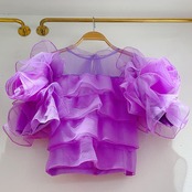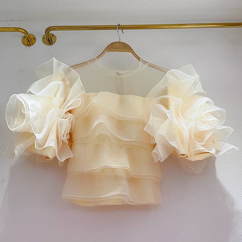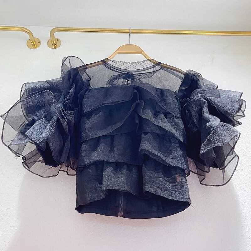 Komiyama sweet Oネック フリル 夏 クロップトップ パフスリーブ ブラウス メッシュ パッチワーク オーガンザ シャツ レディース ラッフル 大人ガーリー スウィート キュート カジュアル サマー 夏物 | eight