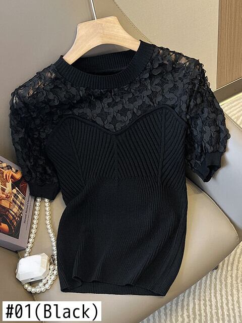 Komiyama Sweet 3d Hook Floral Y2k トップス シック中空アウト Tシャツ O ネック 半袖 Tシャツ 夏 ニット プルオーバー セーター ショート ハーフスリーブ 大人ガーリー スウィート キュート カジュアル サマー 夏物 花柄 Oネック | eight