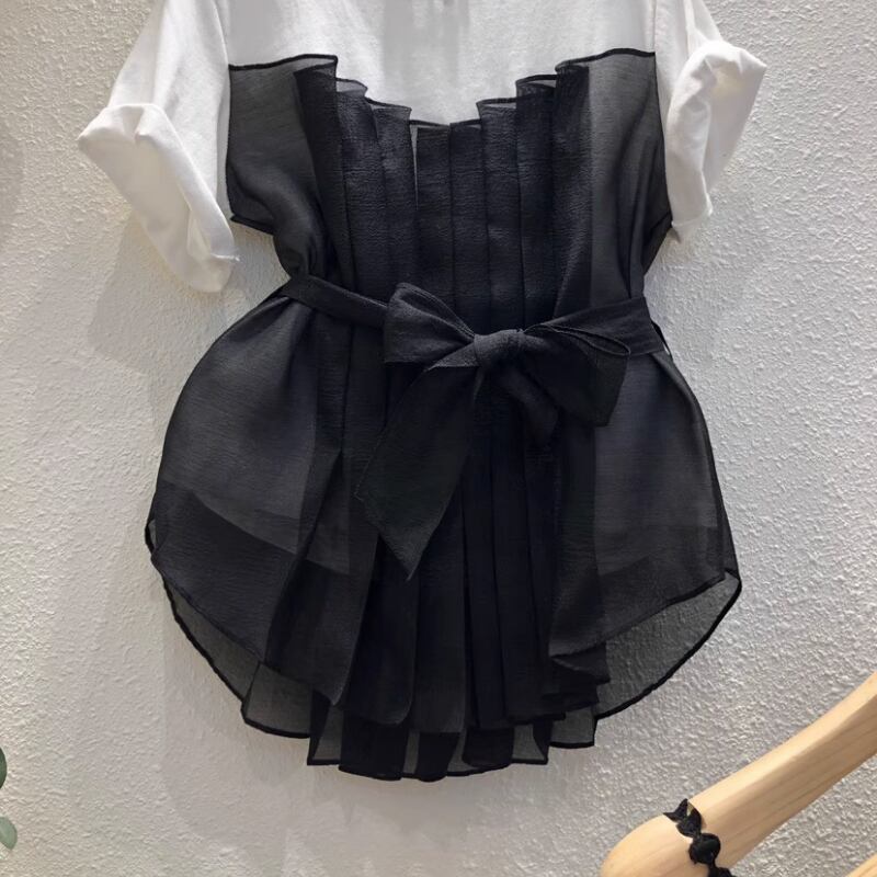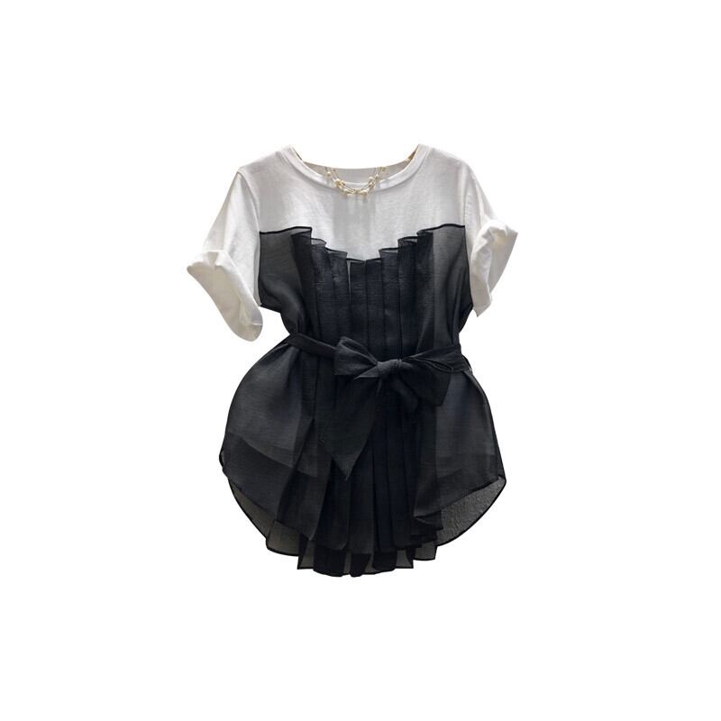 小宮山 レースアップ リボン チュニック シフォン Tシャツ 春夏 Oネック Tシャツ コントラストカラー シャツ ゆったり 半袖 ロパ ショート ハーフスリーブ スプリング 春物 サマー 夏物 | eight