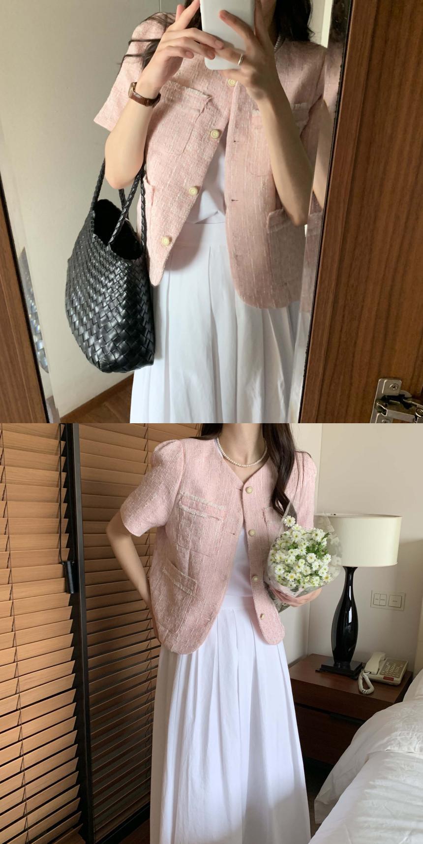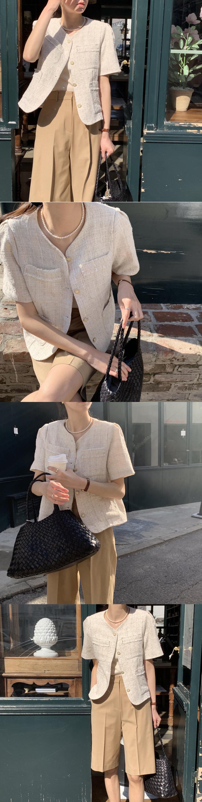 小宮山 O ネックツイードジャケット春夏半袖服マルチポケットコート絶妙シングルブレスト Outwears ショート ハーフスリーブ スプリング 春物 サマー 夏物 Oネック ポケット多め | eight