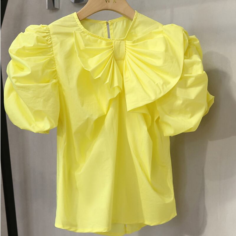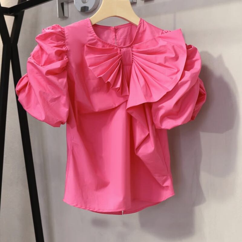 Komiyama Vintsge スウィート O ネック弓シャツ夏シャーリング パフ スリーブ無地シャツ ブラウス リボン 大人ガーリー キュート カジュアル サマー 夏物 Oネック ソリッドカラー | eight