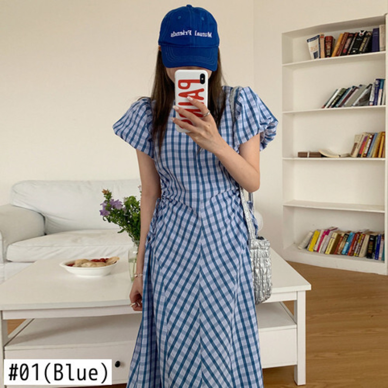 Komiyama Feminino 中空アウトレースアップボウドレス甘いチェック柄 Vestidos サマードレス O ネックパフスリーブローブ リボン 大人ガーリー スウィート キュート カジュアル 夏物 Oネック | eight