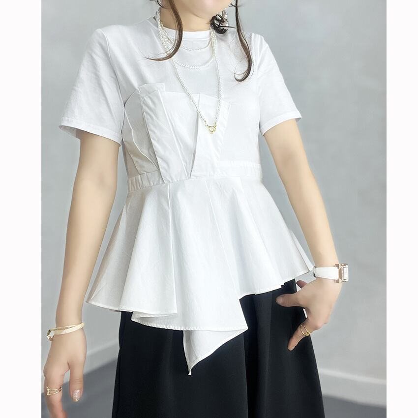 Komiyam シック不規則フリル T シャツ O ネック半袖 Y2k トップス夏チュニック Ropa フェイク ツー T シャツ ショート ハーフスリーブ ラッフル サマー 夏物 Oネック Tシャツ | eight