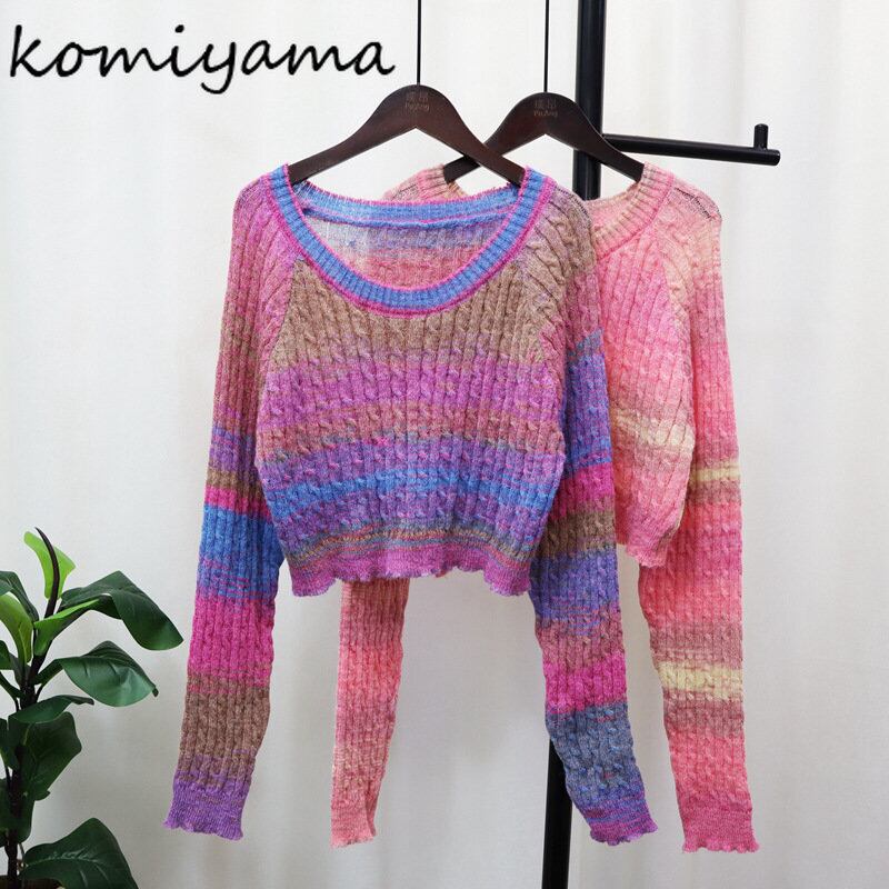 Komiyama コントラストカラーストライプセーター春夏 Y2k 服ツイストプルオーバートップス O ネック長袖 Knitwears ロング スプリング 春物 サマー 夏物 Oネック | eight