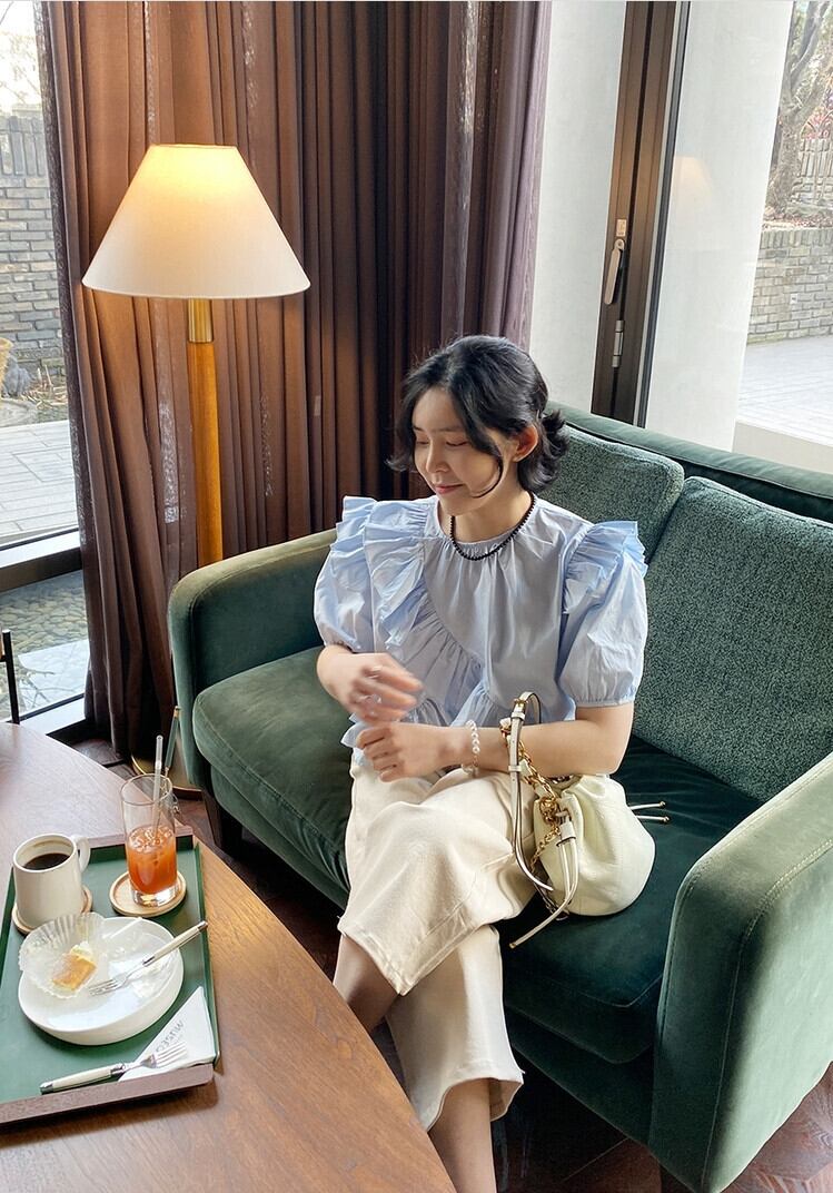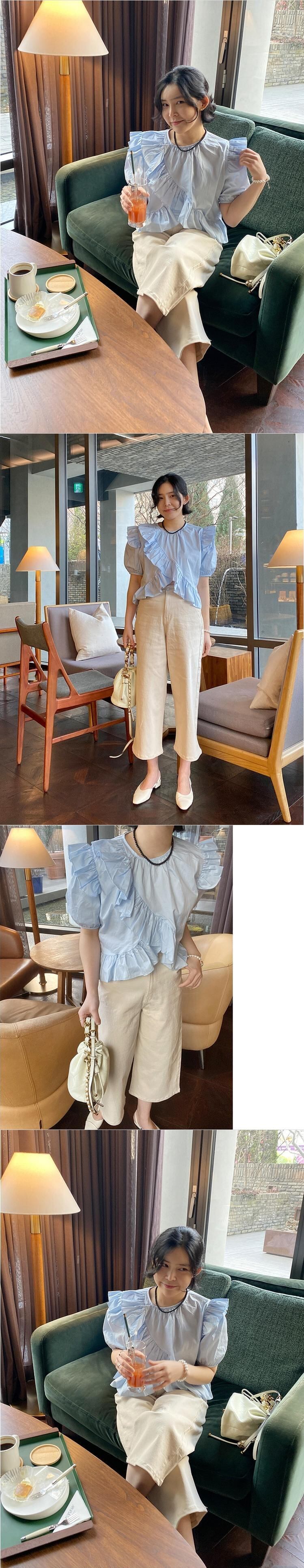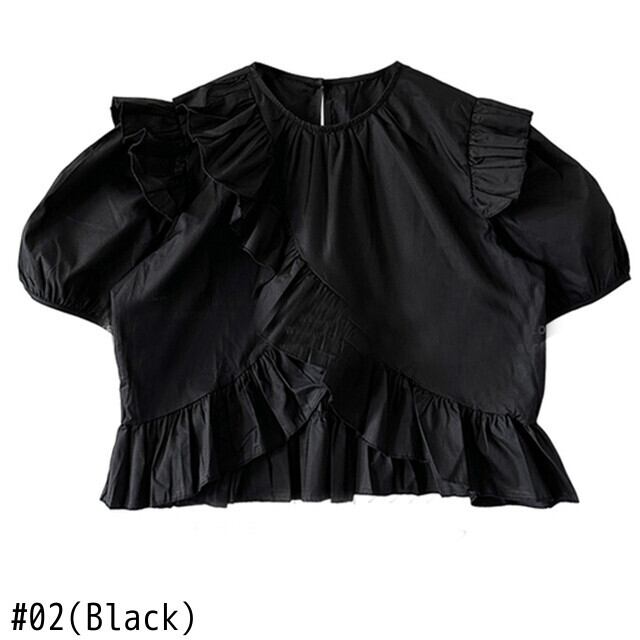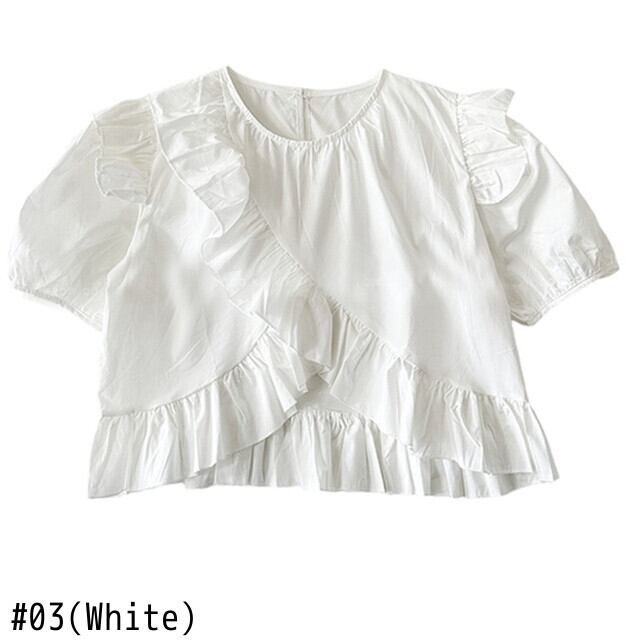 小宮山パッチワーク フリル シャツ ブラウス O ネック半袖夏服スウィート シャツ トップス ショート ハーフスリーブ ラッフル 大人ガーリー キュート カジュアル サマー 夏物 Oネック | eight