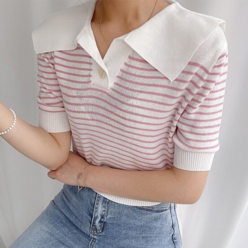 Komiyama 夏コントラストカラーストライプ Tシャツパフスリーブニット Y2k トップスセーラーカラーロパスイートフレッシュ Tシャツ 大人ガーリー スウィート キュート カジュアル サマー 夏物 | eight