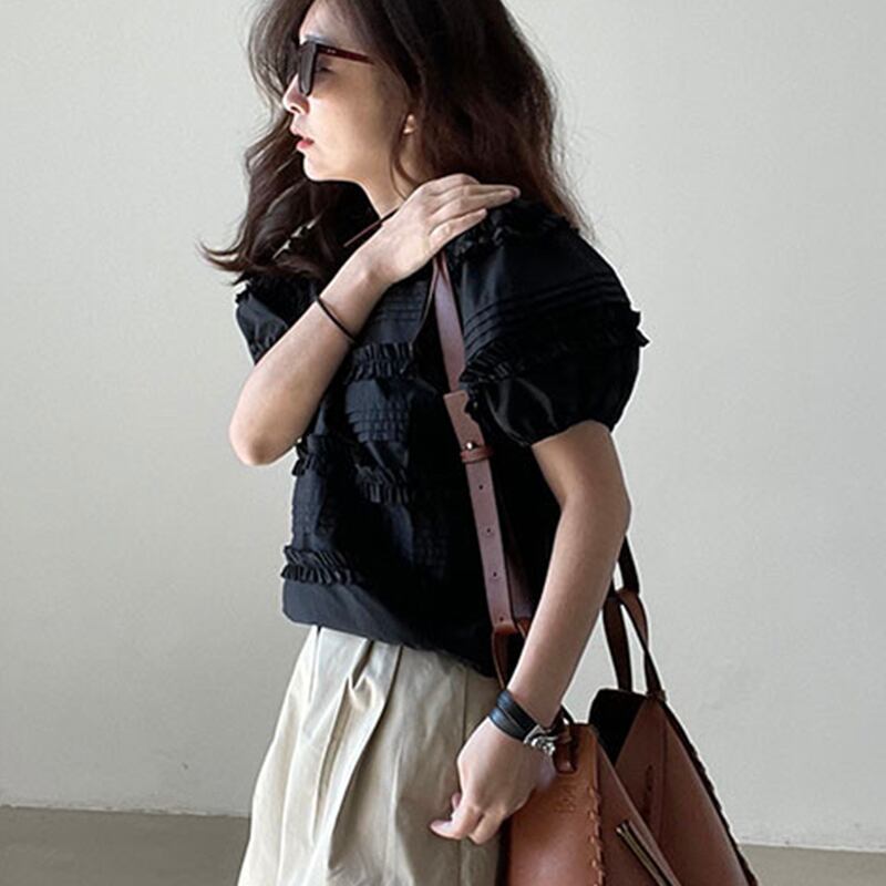 Komiyama パッチワーク菌シャツブラウス甘い O ネック半袖パフシャツトップス夏服 ショート ハーフスリーブ 大人ガーリー スウィート キュート カジュアル サマー 夏物 Oネック | eight
