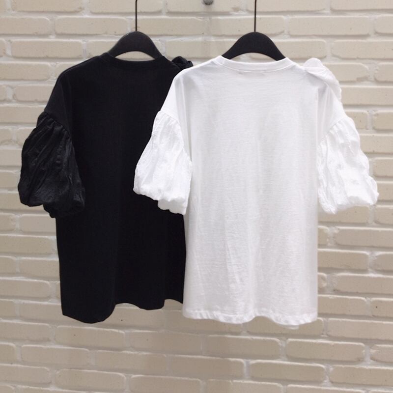 Komiyama 不規則パッチワークちょう結び Tシャツパフ半袖 Y2k トップスルーズ O ネック Ropa 夏 T シャツ ショート リボン ハーフスリーブ サマー 夏物 Oネック | eight