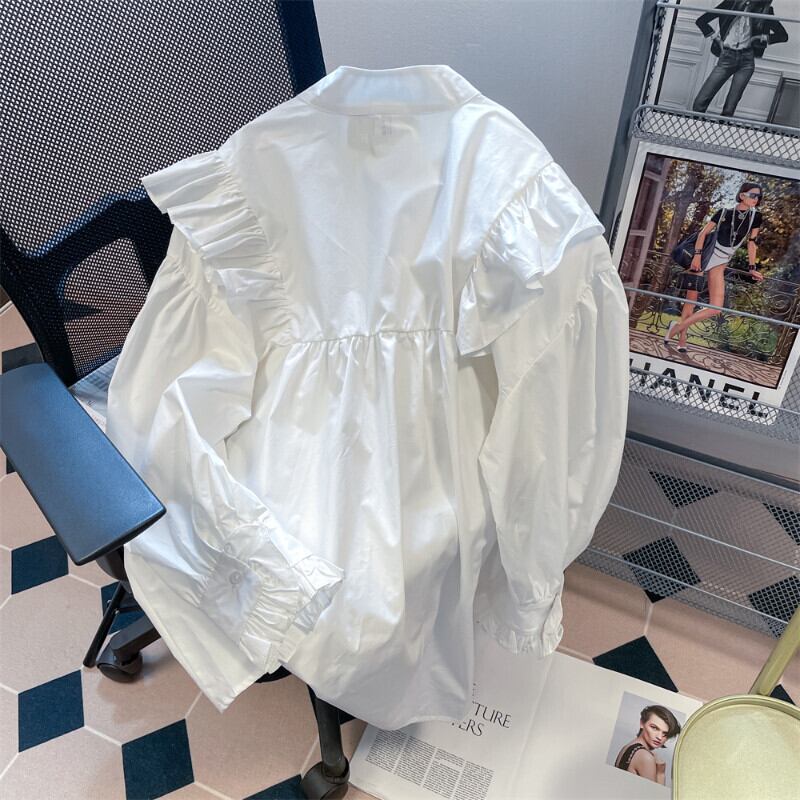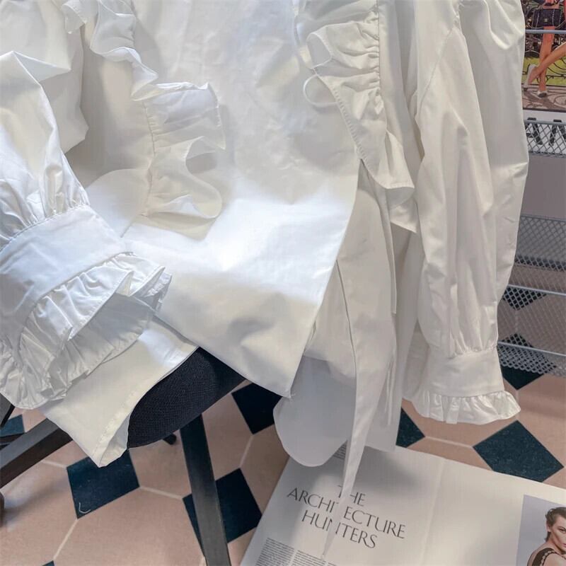 Komiyama フリル白シャツ春モーダレースアップ O ネックシャツブラウス甘い長袖 ロング ホワイト ラッフル 大人ガーリー スウィート キュート カジュアル スプリング 春物 Oネック | eight