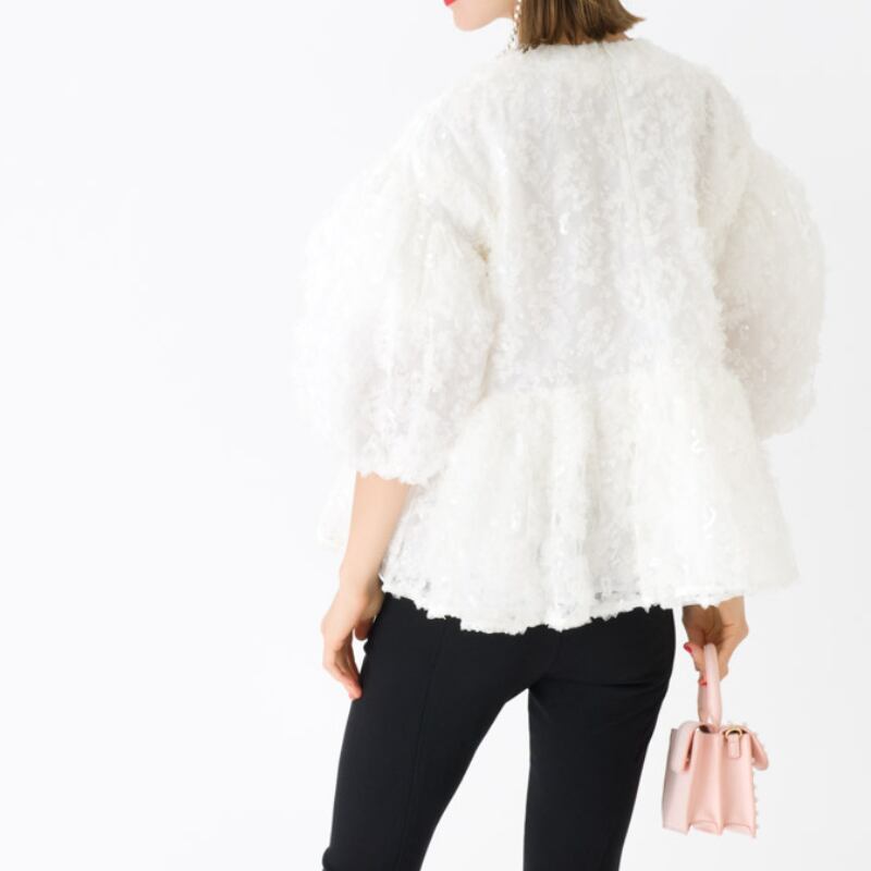 シックヘビーワークスパンコールパッチワークシャツトップス夏甘いパフスリーブブラウススタイル O ネックシャーリング 大人ガーリー スウィート キュート カジュアル サマー 夏物 Oネック | eight