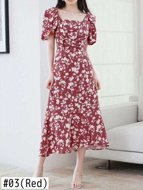 甘いフラワープリントドレス Suqare 襟パフ半袖 Vestidos サマードレスレースアップチュニックローブ ショート ハーフスリーブ 大人ガーリー スウィート キュート カジュアル 夏物 フラワーデザイン | eight