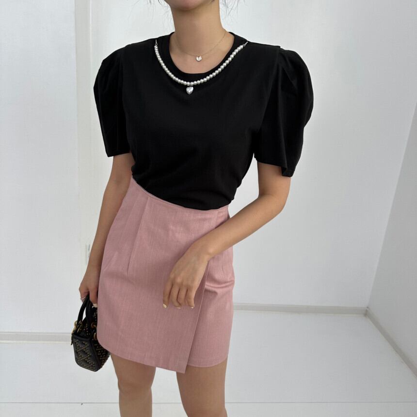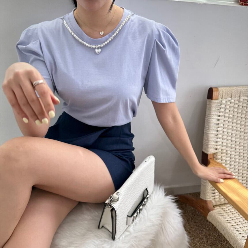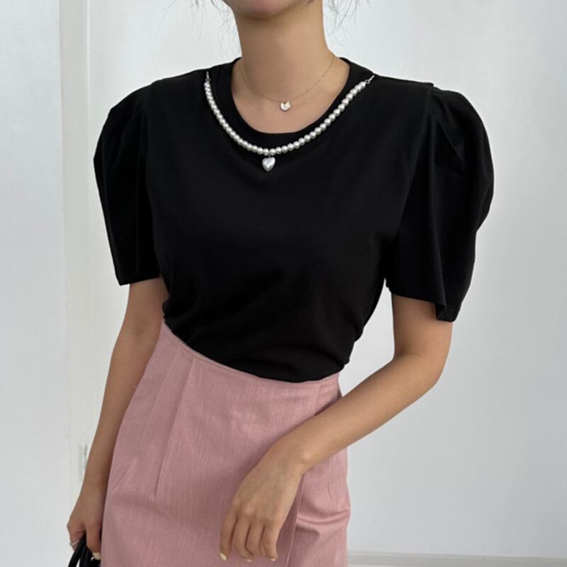 Komiyama 夏パールチェーン Tシャツ O ネックパフ半袖 Y2k トップス Sweet Ropa Comtable Tシャツ ショート ハーフスリーブ 大人ガーリー スウィート キュート カジュアル サマー 夏物 Oネック 真珠 | eight