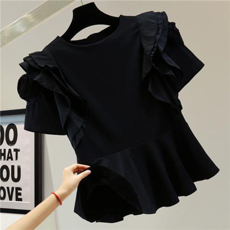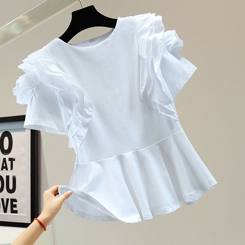 Komiyama 夏シック 3D 花柄 Tシャツ フリル半袖 Y2k トップス ラウンドネック Ropa シャーリング裾 Tシャツ ショート ハーフスリーブ ラッフル サマー 夏物 Oネック | eight