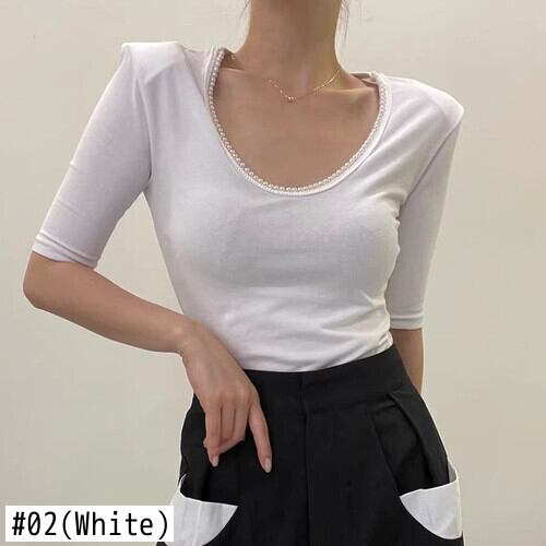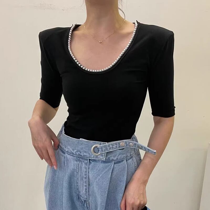 Komiyama O ネックビーズスティーズ Femininio セクシー底 Y2k トップス鎖骨露出 Ropa 夏半袖 T シャツ ショート ハーフスリーブ サマー 夏物 Oネック Tシャツ | eight