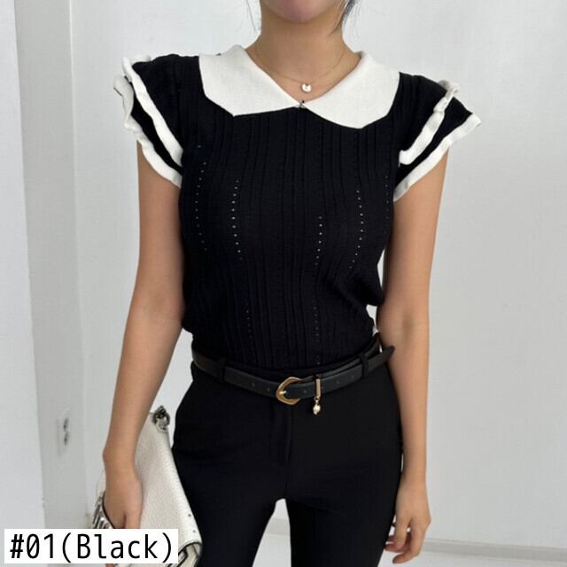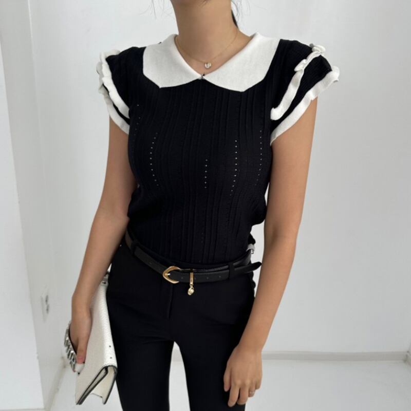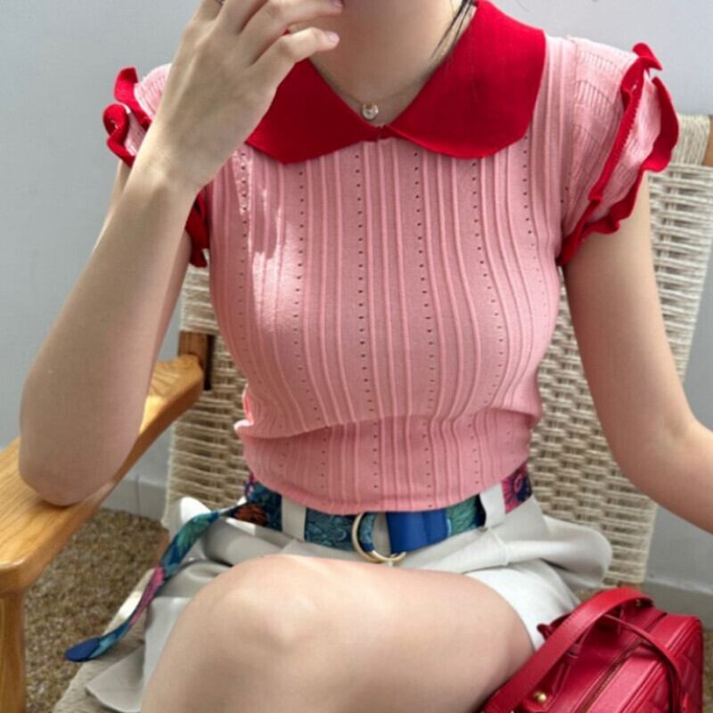 Komiyama 夏フライングスリーブニット Tシャツシックヒットカラー Y2k トップススイートロパピーターパンカラー Tシャツ 大人ガーリー スウィート キュート カジュアル サマー 夏物 | eight
