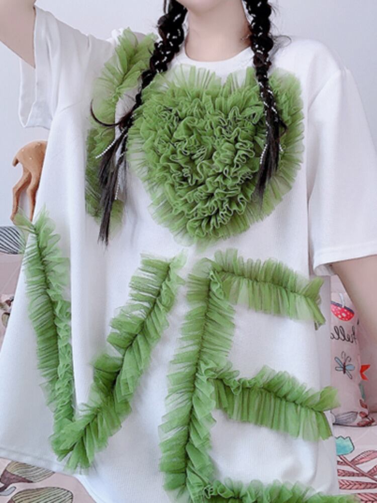 Komiyama スイートシック 3D メッシュフラワーハート Tシャツルーズ O ネック半袖 Y2k トップスヒットカラーロパサマーレター Tシャツ ショート ハーフスリーブ 大人ガーリー スウィート キュート カジュアル 夏物 Oネック フラワーデザイン | eight