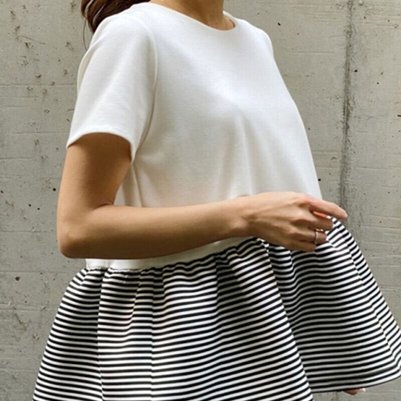 Komiyama パッチワークストライプ裾 Tシャツ夏ルーズ O ネック半袖 Y2k トップスヒットカラー Ropa ese シック Tシャツ ショート ハーフスリーブ サマー 夏物 Oネック | eight