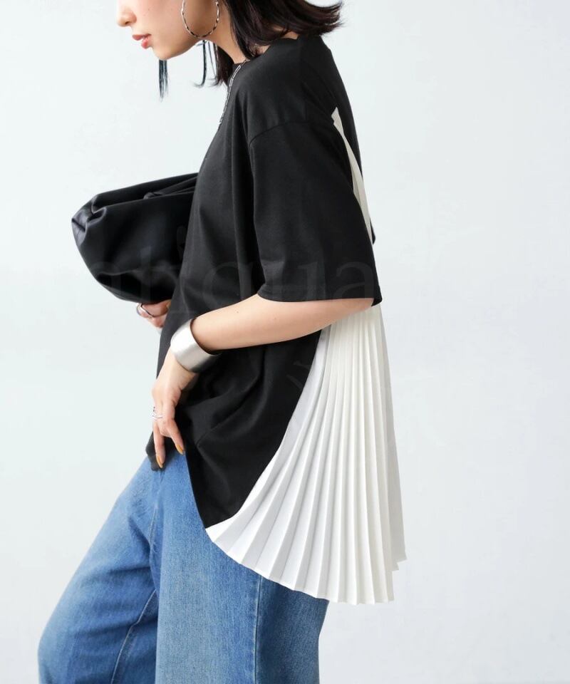 Komiyama 夏不規則プリーツ Tシャツ ese ルーズ O ネック半袖 Y2k トップス ヒットカラー ロパ シャーリング Tシャツ ショート ハーフスリーブ サマー 夏物 Oネック | eight