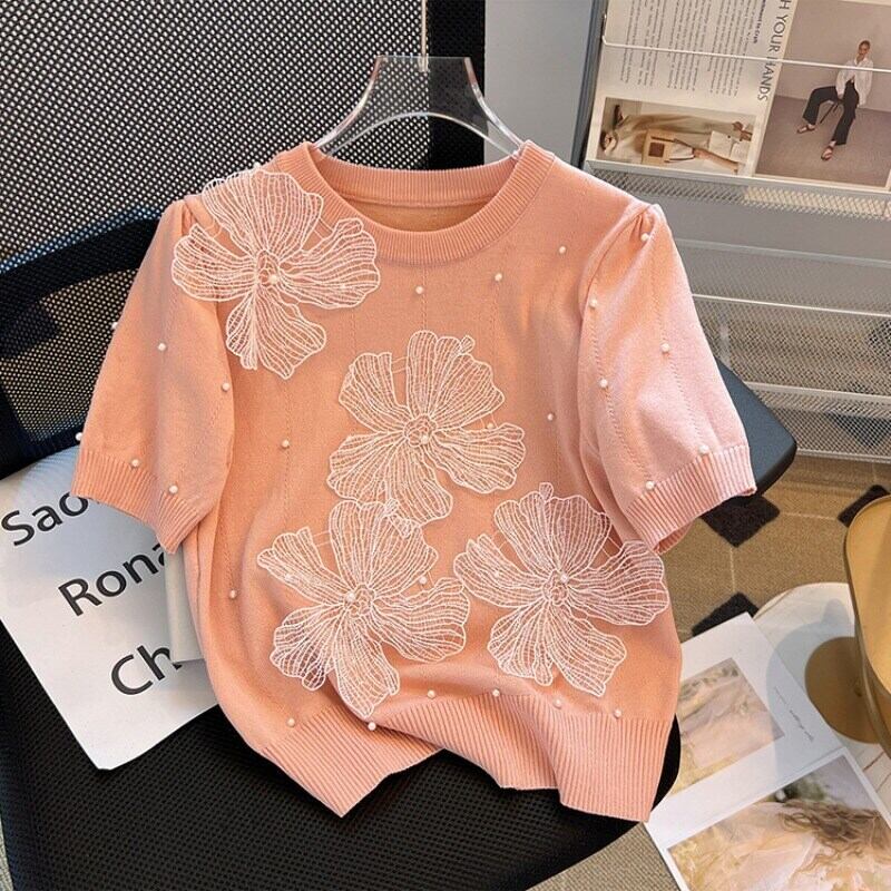 Komiyama パッチワークビーズ Tシャツ夏シック 3d 花柄 Y2k トップスラウンドネック半袖 Ropa 甘い T シャツ ショート ハーフスリーブ 大人ガーリー スウィート キュート カジュアル サマー 夏物 Oネック | eight