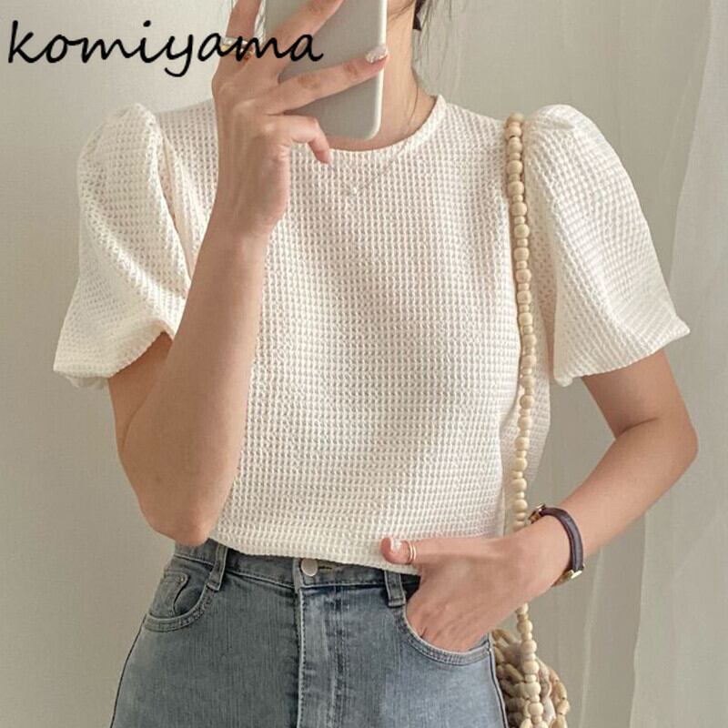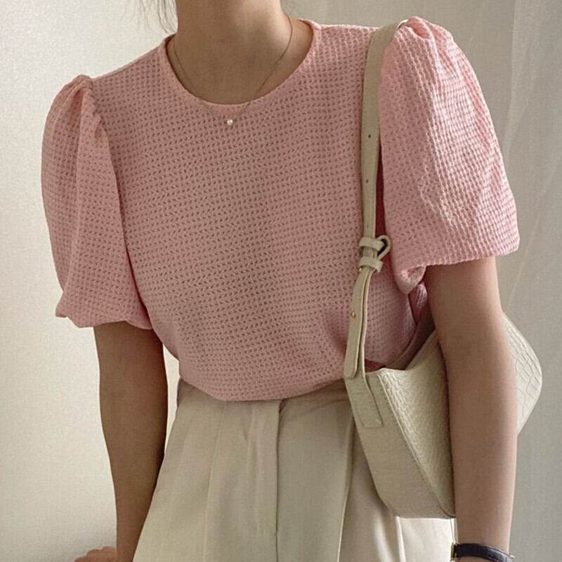 Komiyama 中空アウトチェック柄ストライプ O ネックブラウス夏シンプルオールマッチソリッドプルオーバーシャツ甘くて新鮮パフスリーブ シャツ 大人ガーリー スウィート キュート カジュアル サマー 夏物 Oネック ソリッドカラー | eight