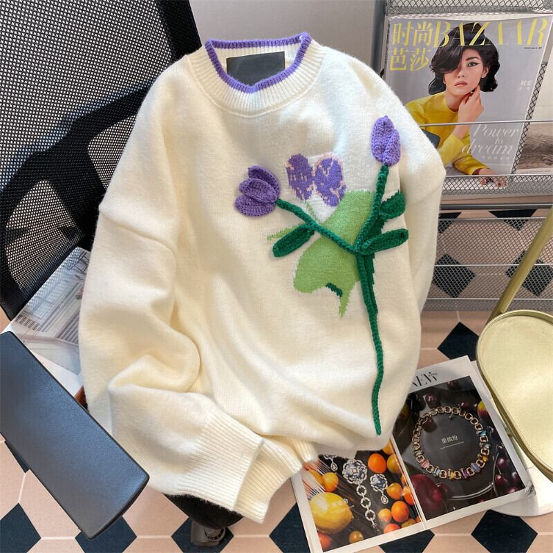 Komiyama 秋冬レディース 3d チューリップ花柄ニット O ネック長袖セータースイートシックプルオーバートップス ロング 大人ガーリー スウィート キュート カジュアル オータム 秋物 ウィンター 冬物 Oネック | eight