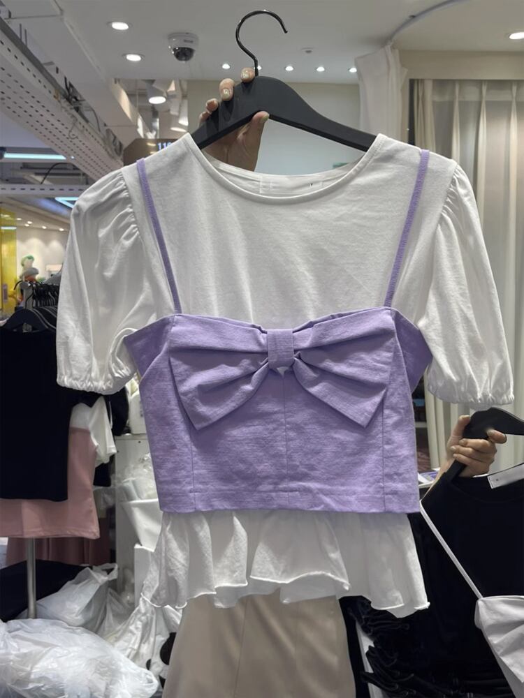 小宮山シックスーツ Y2k トップス サマー Tシャツ ルーズ半袖 Tシャツ スイートロパ ボウキャミ付き ショート リボン ハーフスリーブ 大人ガーリー スウィート キュート カジュアル 夏物 | eight