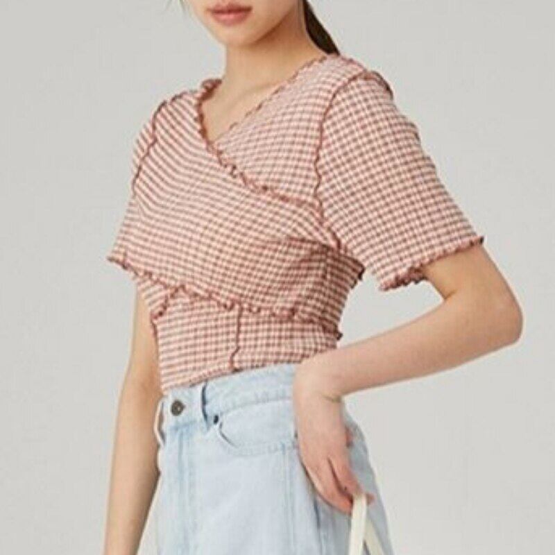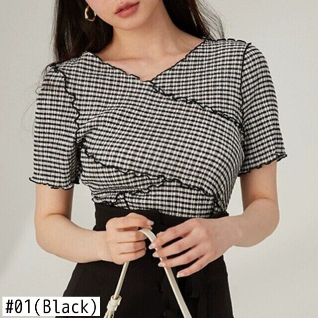 夏パッチワーク菌 Y2k トップスヒットカラーチェック柄 Tシャツ V ネック半袖 Tシャツスタイル弾性 Ropa ショート ハーフスリーブ エラスティック 伸縮 サマー 夏物 Vネック | eight