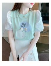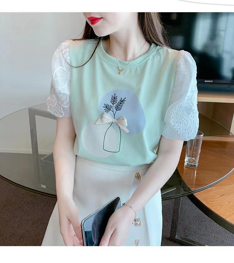 Komiyama スウィートシックプリント Y2k トップス夏パッチワークボウ Tシャツレースパフ半袖 Tシャツソリッド O ネック Ropa ショート リボン ハーフスリーブ 大人ガーリー キュート カジュアル サマー 夏物 Oネック ソリッドカラー | eight