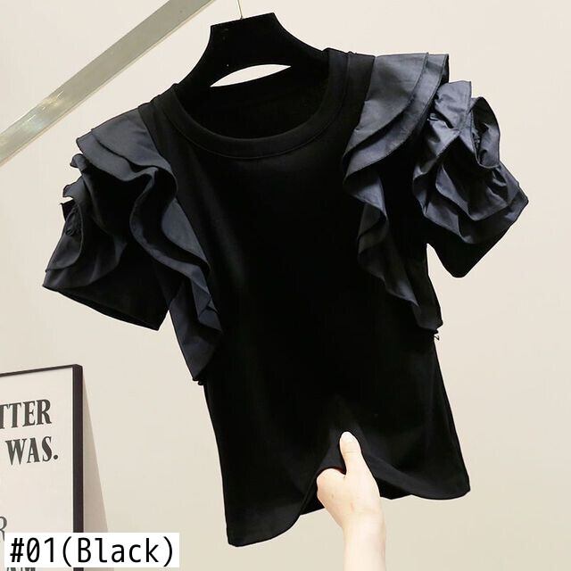 Komiyama スプライスフリル Y2k トップス夏ラウンドネック半袖 Tシャツソリッドオールマッチ Tシャツスイートシックロパ ショート ハーフスリーブ ラッフル 大人ガーリー スウィート キュート カジュアル サマー 夏物 Oネック ソリッドカラー | eight