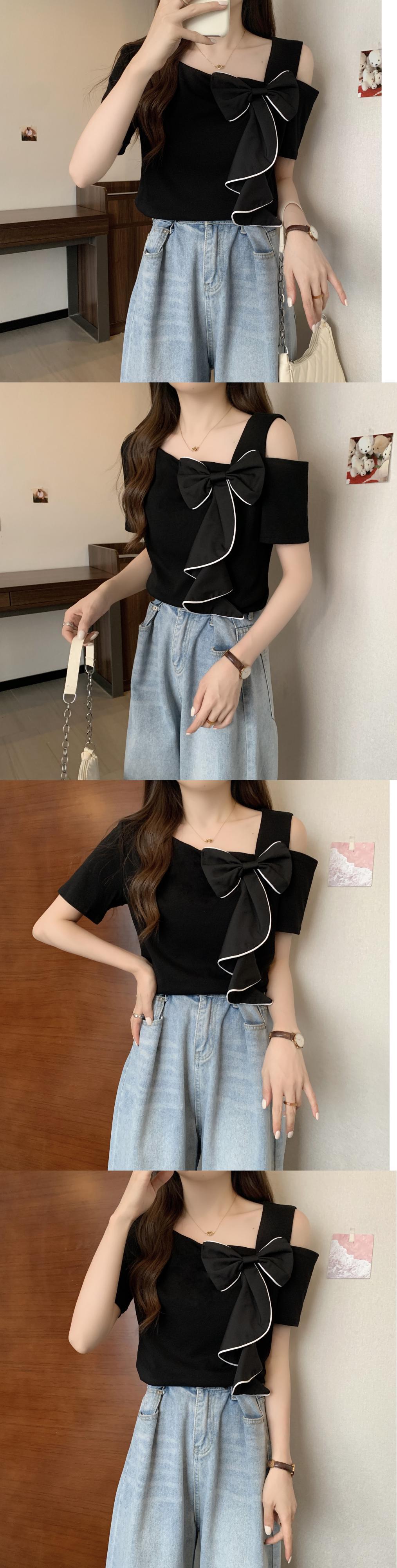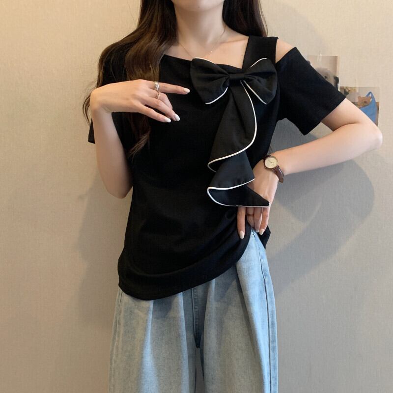 Komiyama シック弓菌 Y2k トップス夏 Feminino セクシーオフショルダー Tシャツ不規則 Tシャツ半袖 O ネック Ropa ショート リボン ハーフスリーブ サマー 夏物 Oネック | eight
